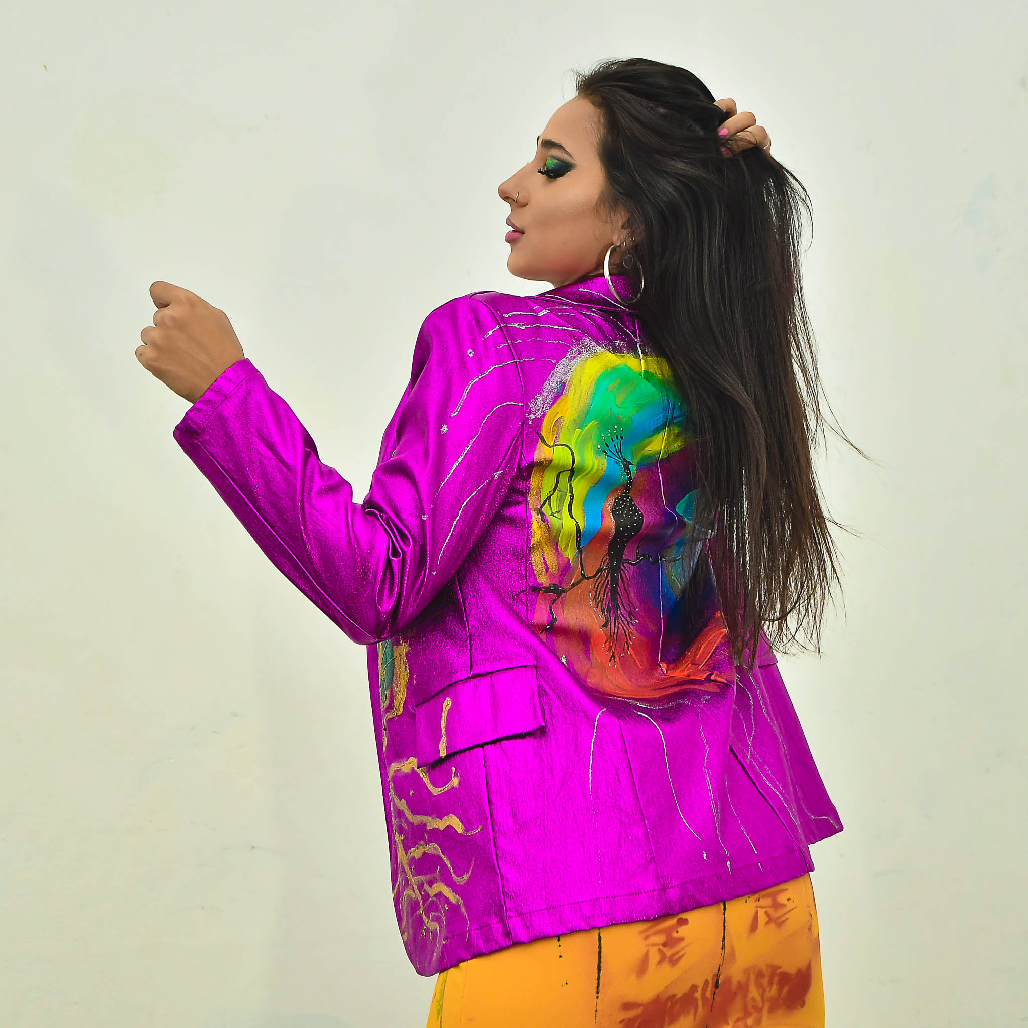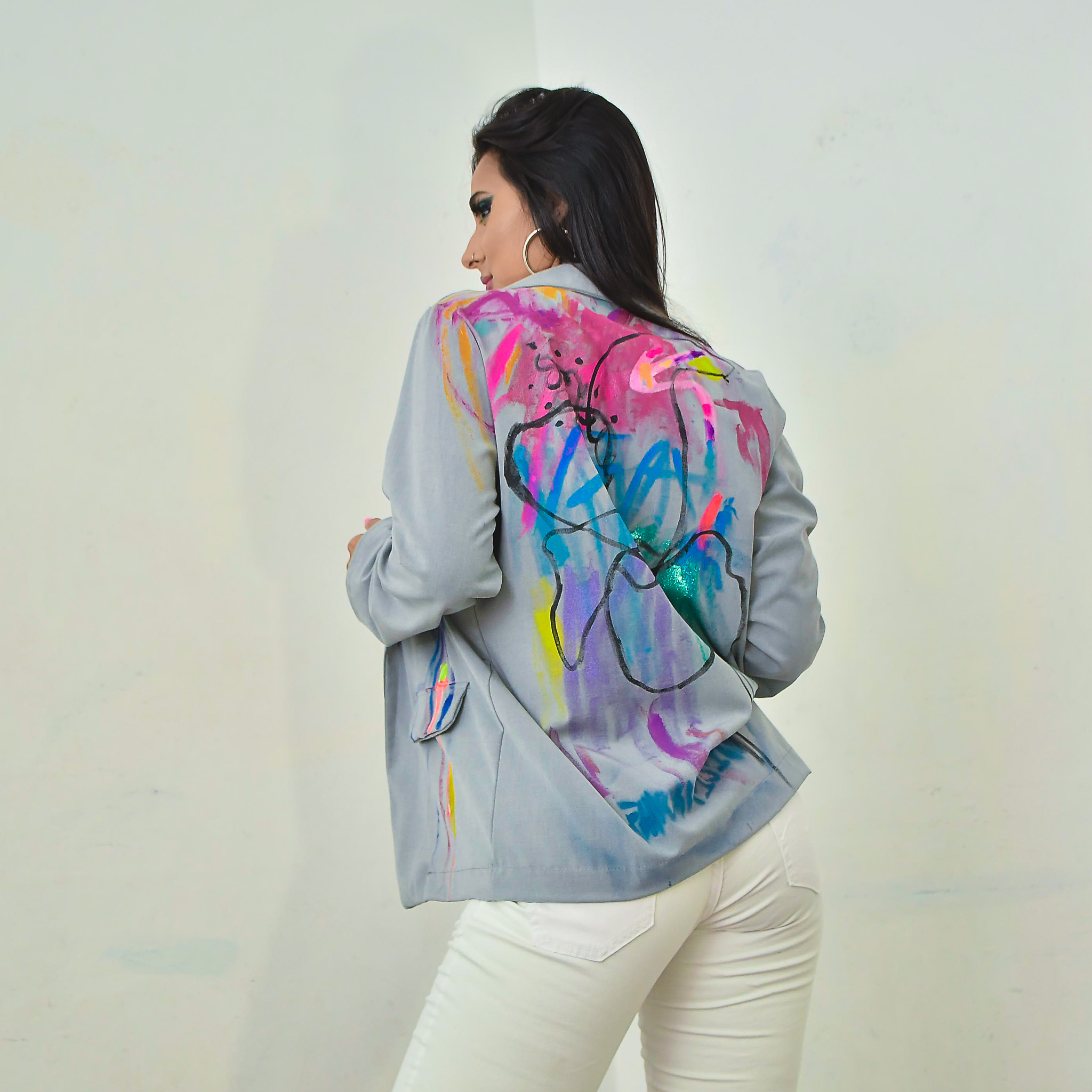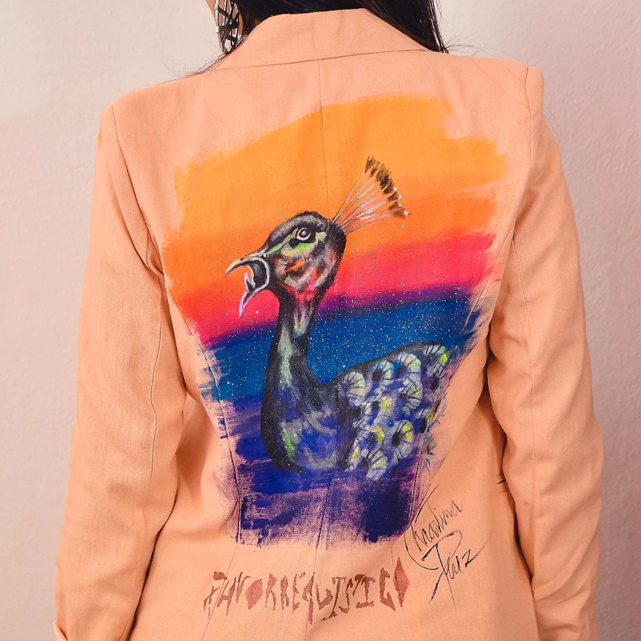 Saco metalizado, diseño espalda pluma pavo real.
