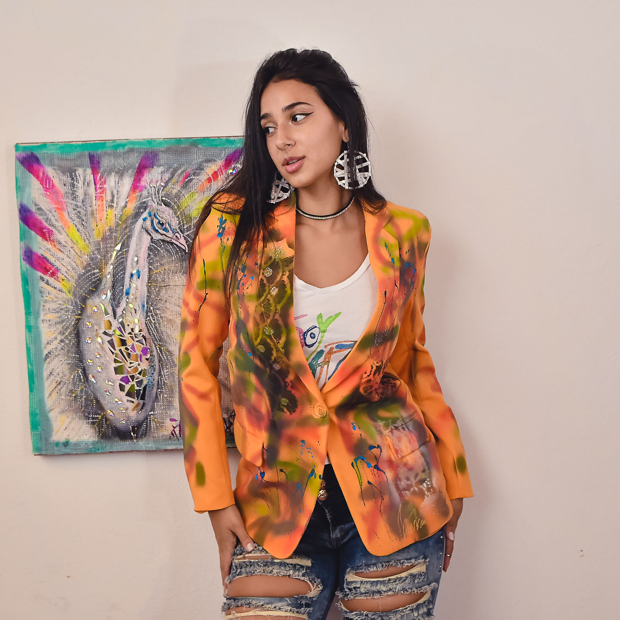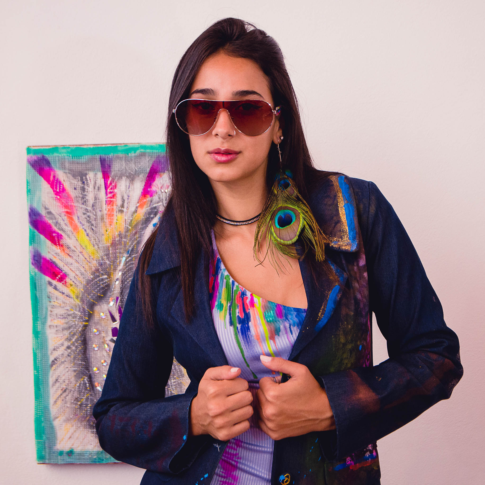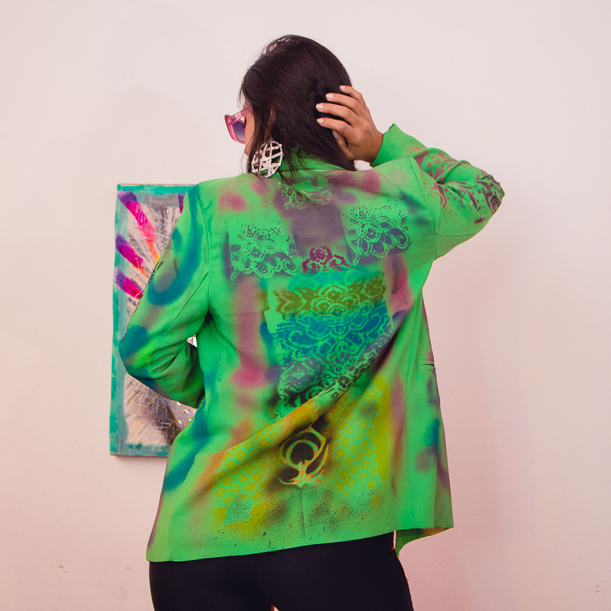 Saco metalizado, diseño espalda pluma pavo real.