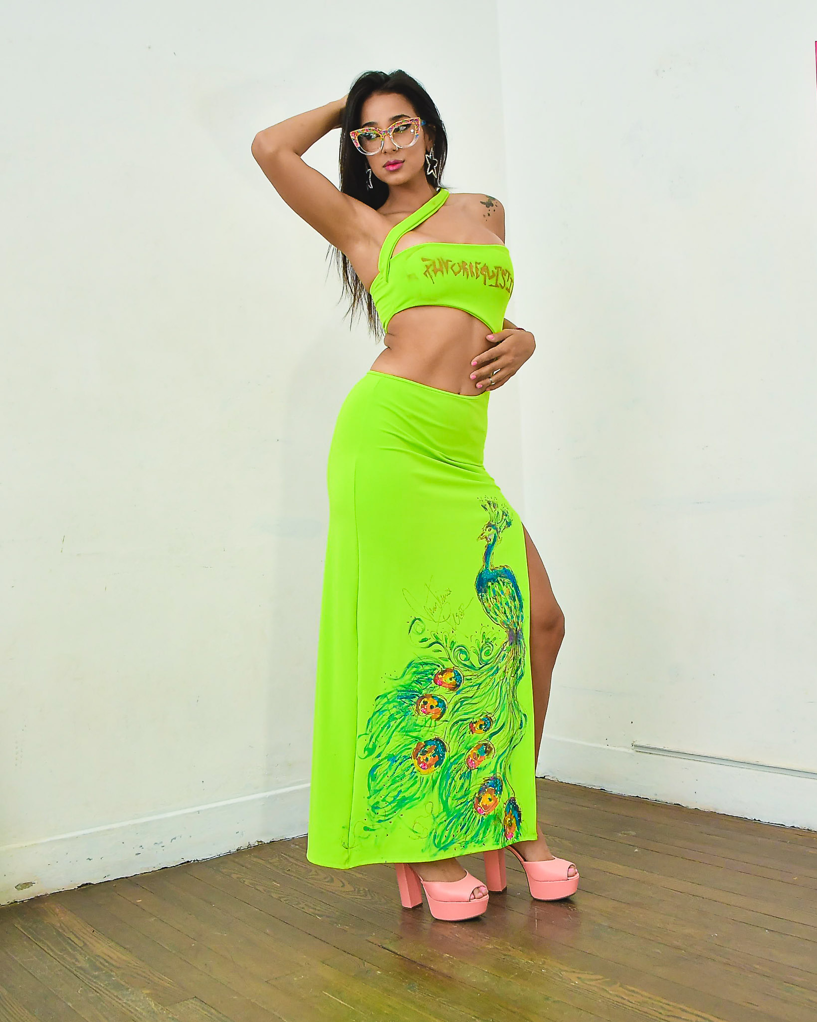 Vestido lima, diseño pavo real con cristales.